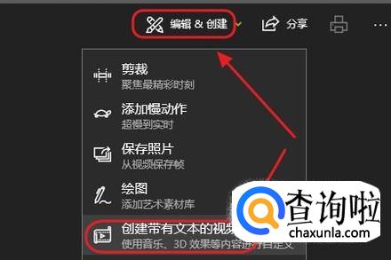 下图一就是通过照片查看器打开的情形,然后在软件的右上角点击“编辑&创建”-“创建带有文本的视频”;