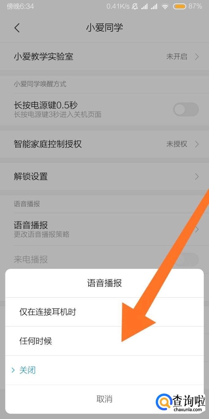 把“语音播报”设置为“任何时候”。