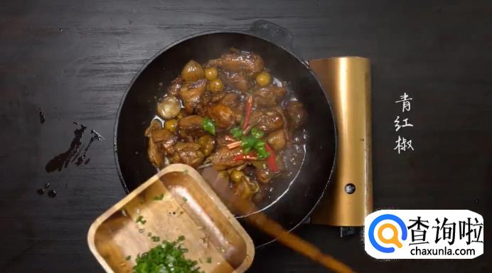 时间到了之后,往锅里加入青红椒,翻炒几下之后撒上适量葱花即可出锅。这样,板栗烧鸡就做好了。