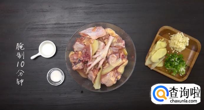 接着,把姜切成片,放在切好的鸡块上,撒上适量的盐,淋入料酒,用筷子搅拌均匀后,静置在一旁腌制10分钟。