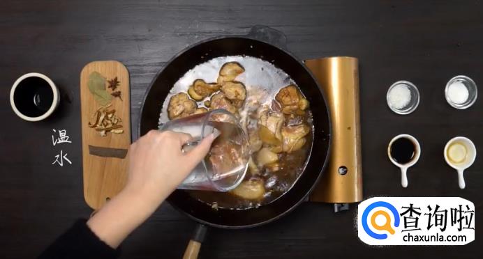 然后,依次加入生抽、老抽、白糖、盐和黄酒,和鸡肉一起混合均匀。再倒入适量温水,加八角、香叶、陈皮和桂皮,烧开后盖上锅盖炖20分钟。