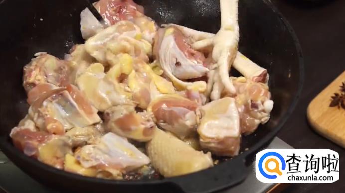 热锅起油,先放入姜片翻炒几下,再放入蒜末炒香,然后放入花椒,再将腌制好的鸡肉放进锅中搅拌均匀。
