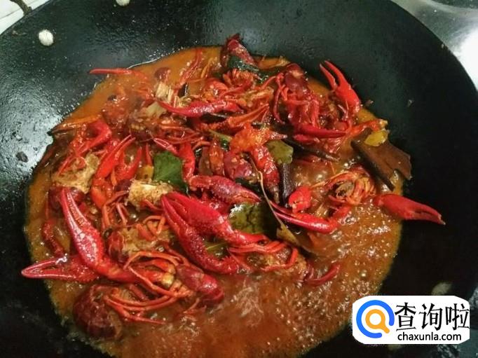 往锅中加水,煮开后,放入盆中炸制备用的小龙虾,不停上下翻炒小龙虾。