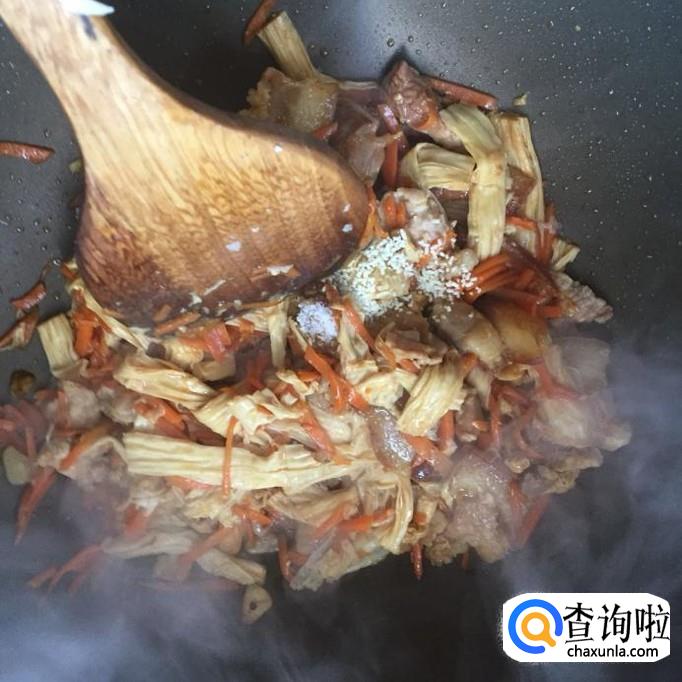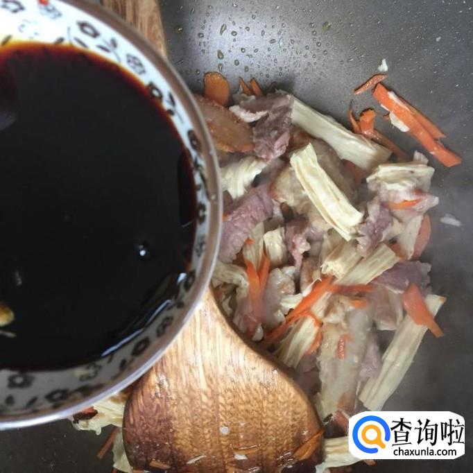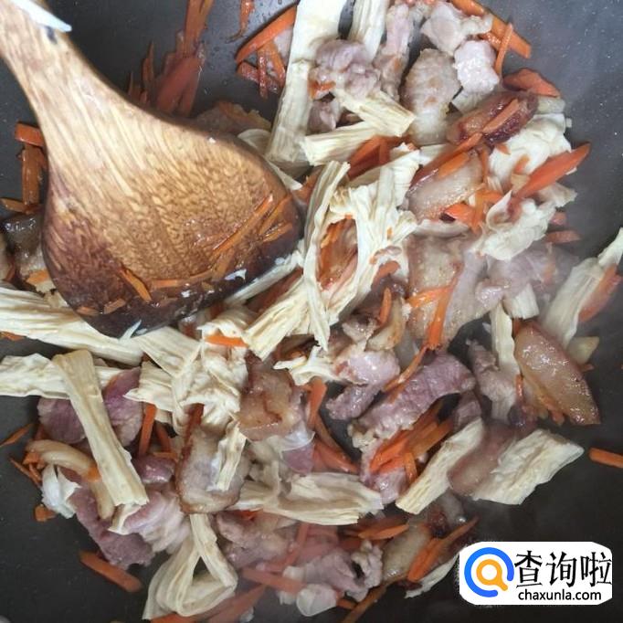 把腐竹洗净切成小段,倒进锅中翻炒两分钟。