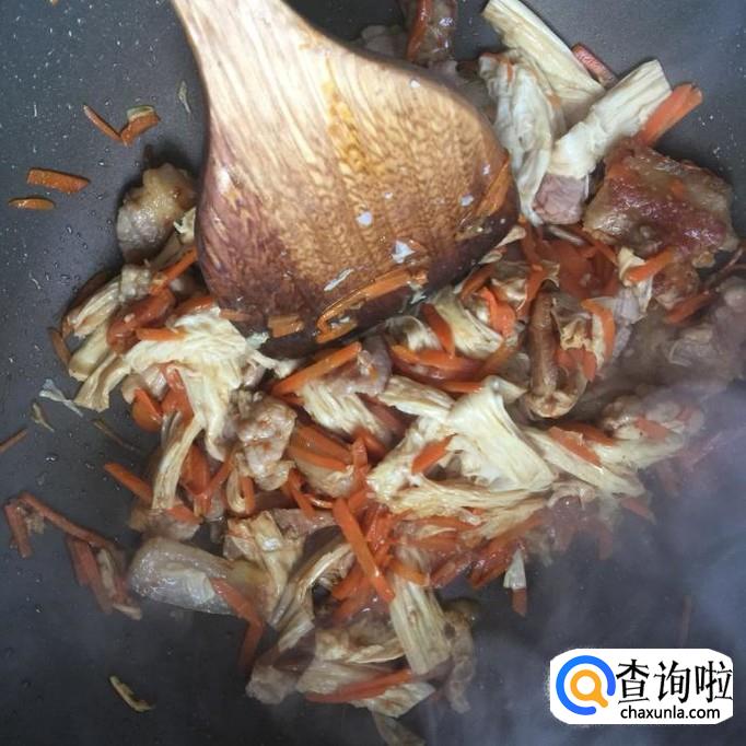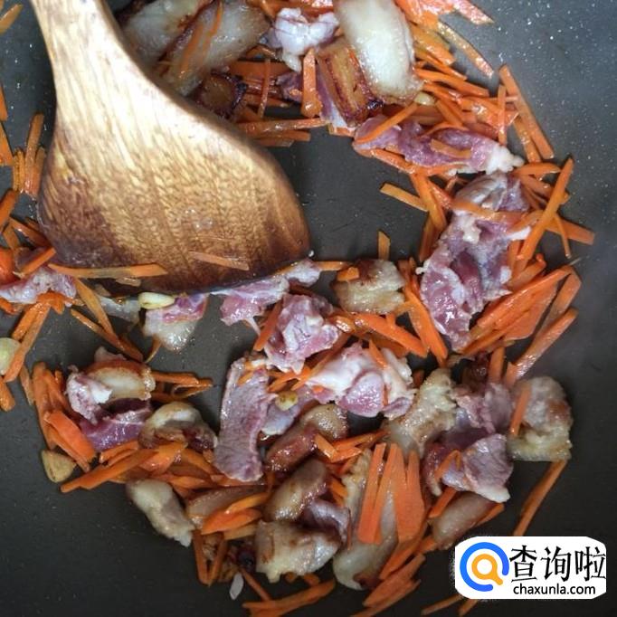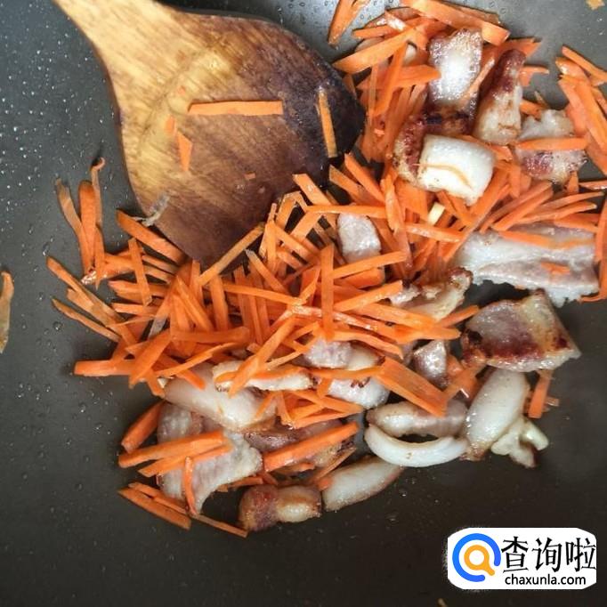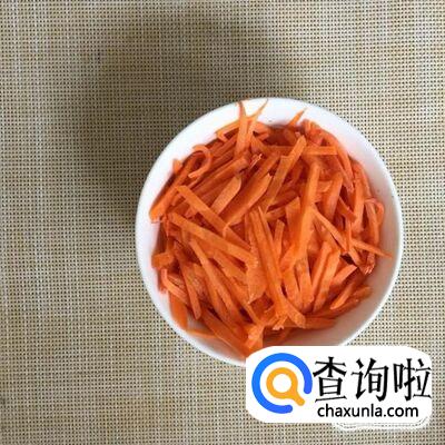 然后将胡萝卜去皮切成丝,倒进锅中翻炒三分钟。