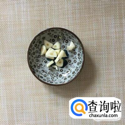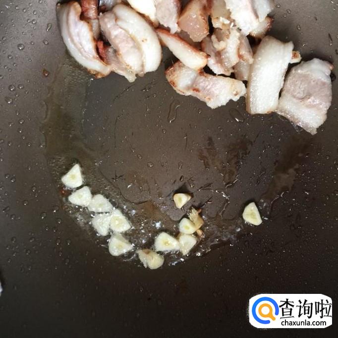 首先将蒜头切成蒜蓉,腿肉中的肥肉切成薄片,倒入锅中炸油,接着把蒜蓉倒进锅中爆香。