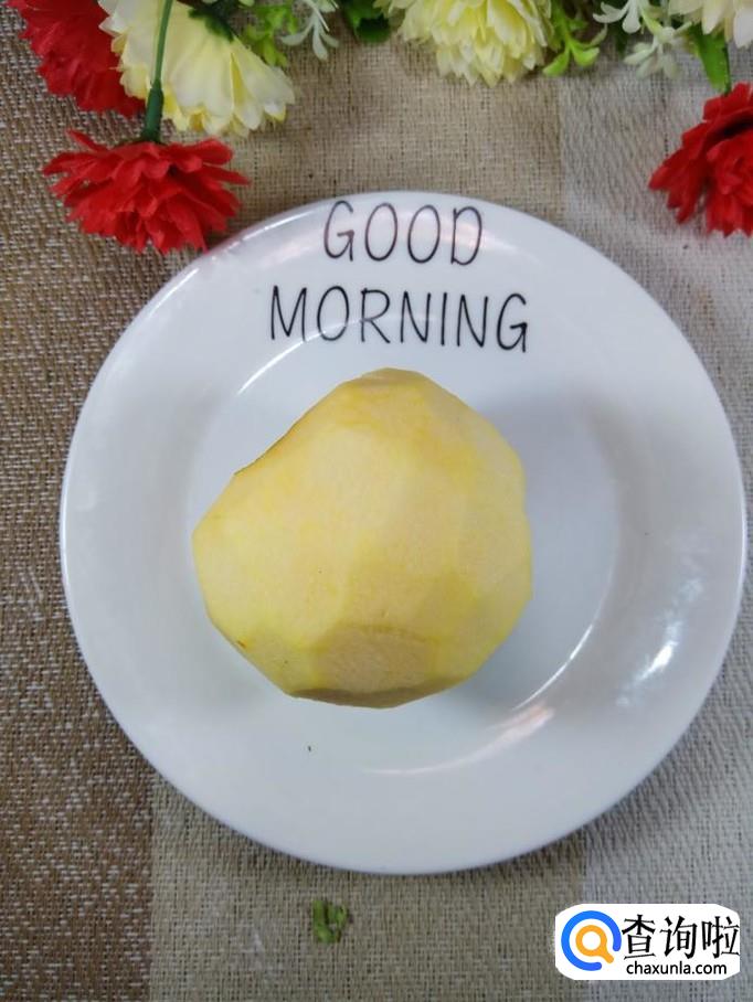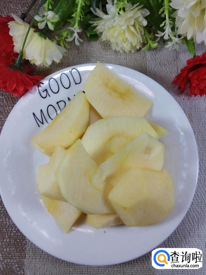 准备一个苹果,削去外皮,切成滚刀块,放入盘中备用。小贴士:苹果尽量用红富士苹果,这样口感更加香甜。
