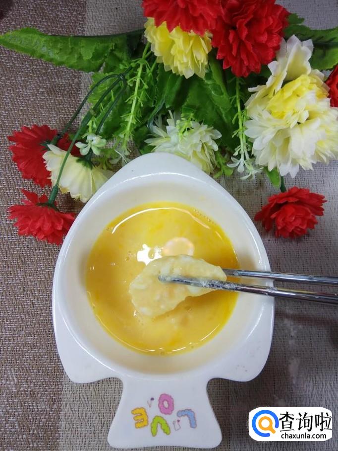 碗中加入适量白砂糖,将鸡蛋打散,让裹满淀粉的苹果,沾满鸡蛋液。