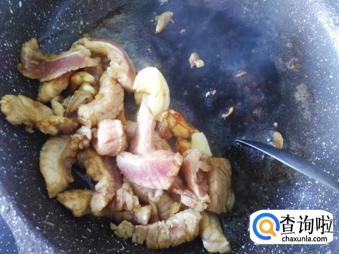 肉丝下锅,大火翻炒至变色,然后铲到锅边,再下适量的油到锅空格。
