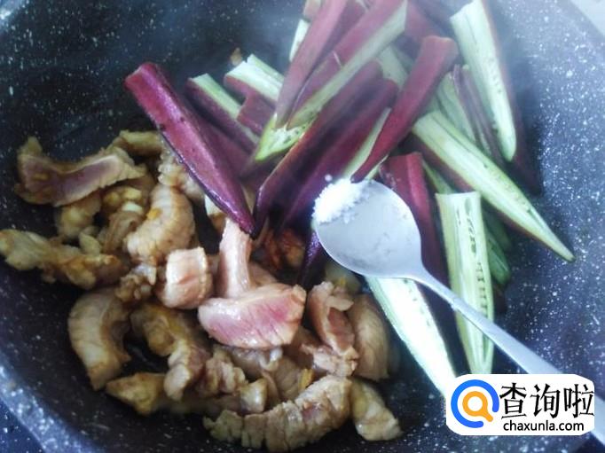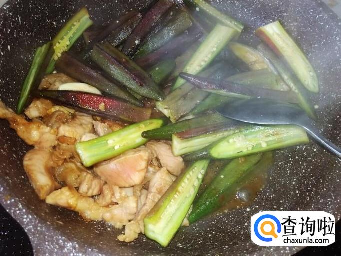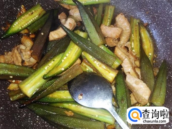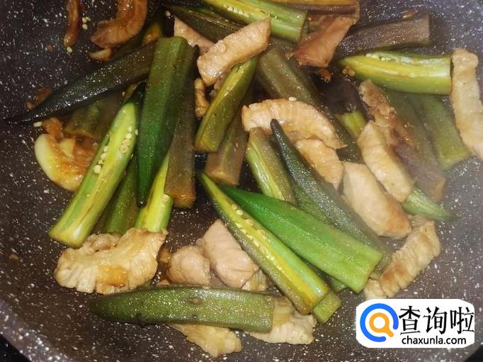 秋葵下锅,加适量的盐煸炒至变软。