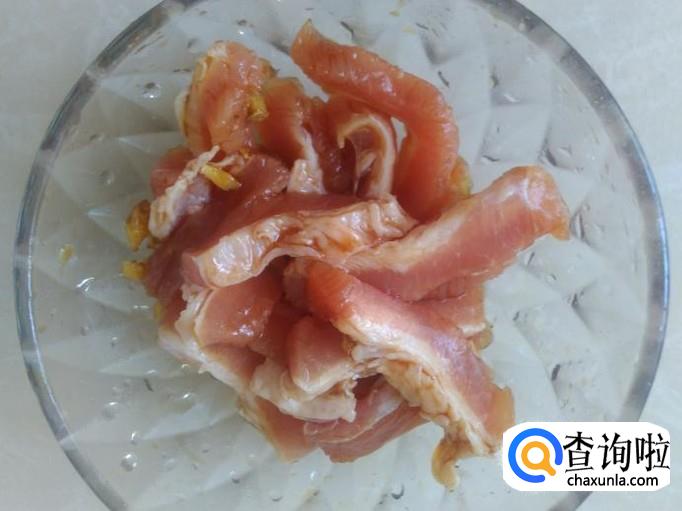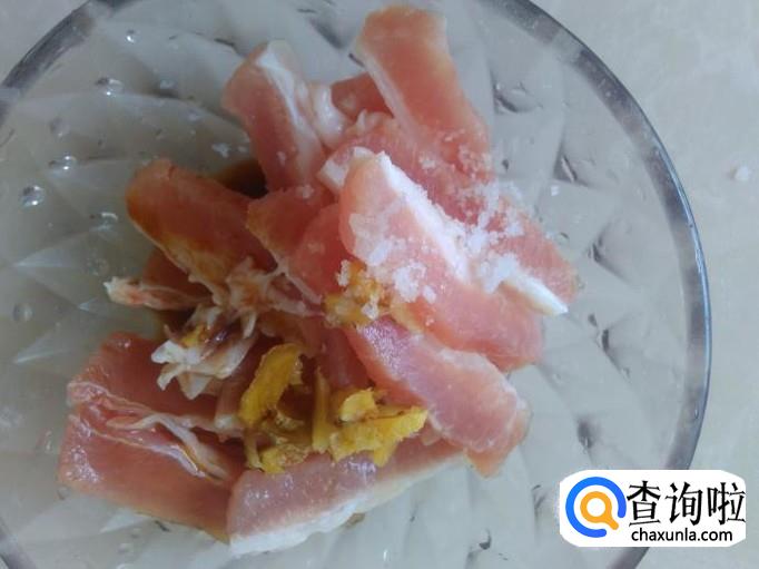 瘦肉切成粗丝,加姜蓉、生抽、料酒腌制几分钟。