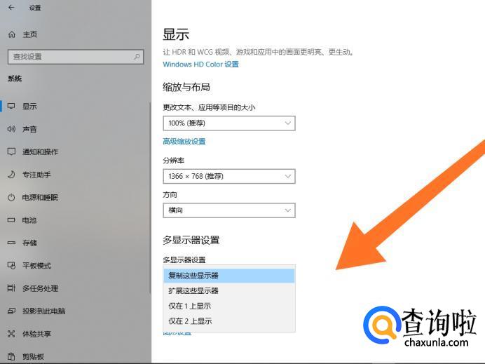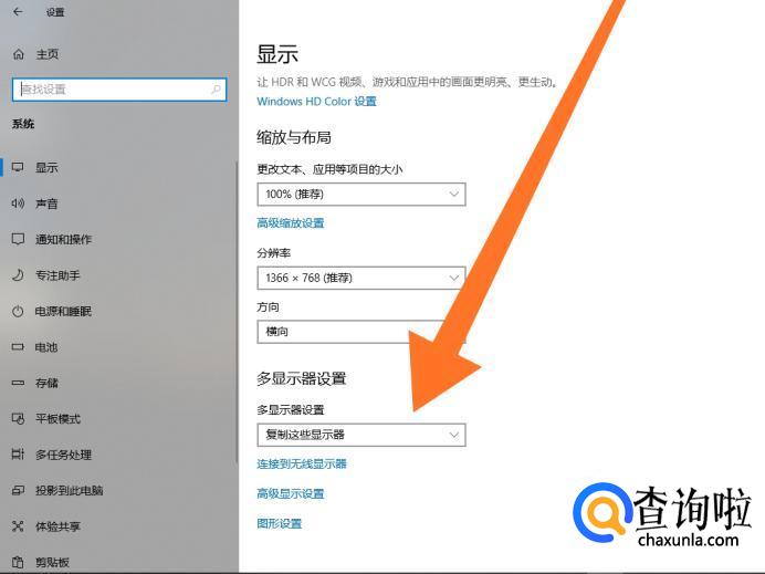 最后还可以点击“多显示器设置”选项,设置外接显示器的具体显示内容。“复制这些显示器”指外接显示器和电脑同步显示画面,“扩展这些显示器”指扩展屏幕相当于主屏幕的一部分,扩展屏幕没有任务栏,也不能把程序快捷按钮锁在扩展屏幕上,但通过移动鼠标就可以把任务窗口从一个屏幕上拖到另一个屏幕上,“仅在2上显示”指外接显示器显示画面,电脑屏幕不显示画面。