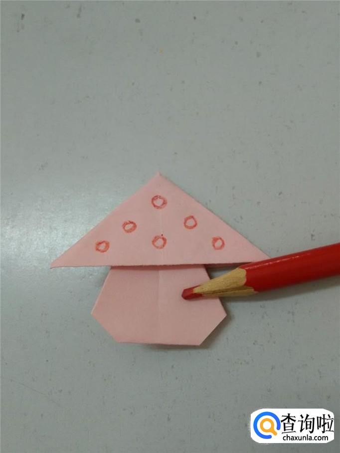 把纸反过来,用彩笔在上面的三角形上画出几个小圆圈,一个小蘑菇就折好了。