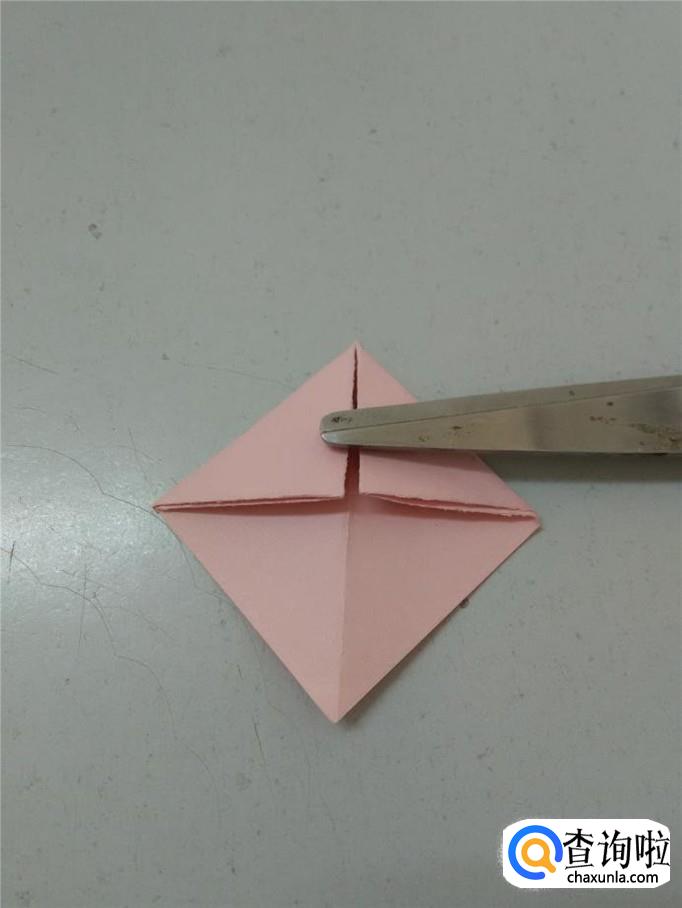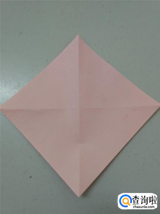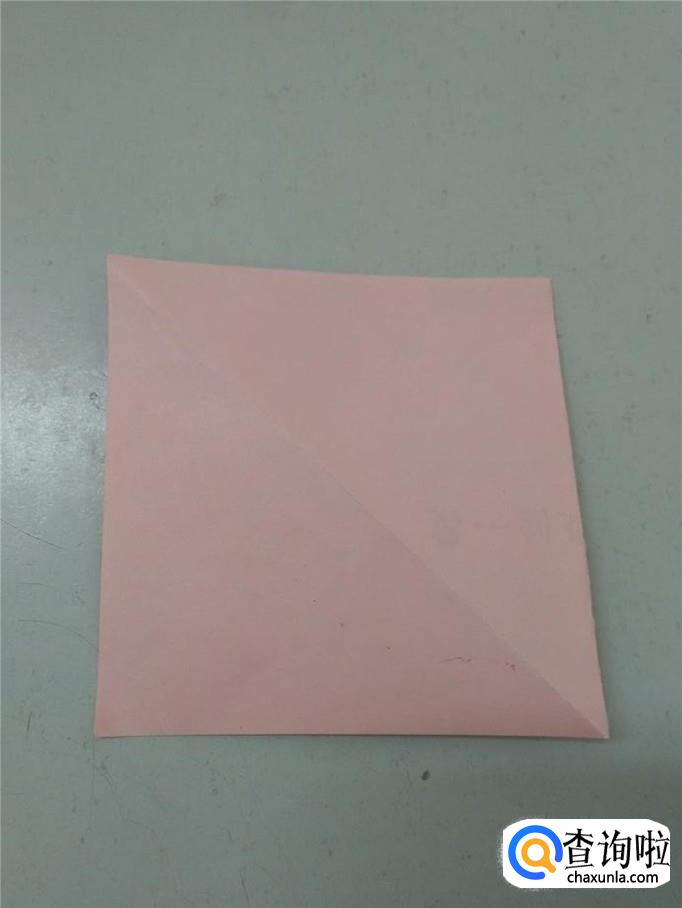将正方形的彩纸角与角对折,再打开,得到中间的两条对角线。