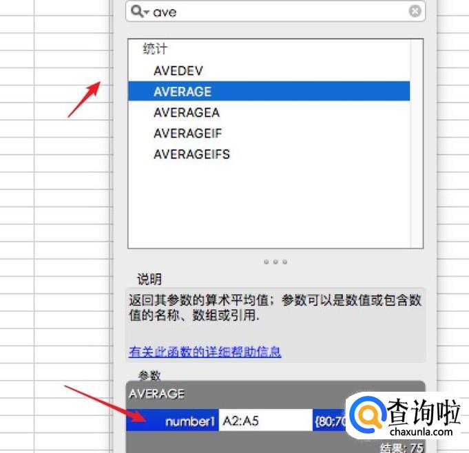 弹出一个公式生成器。在这个窗口上,输入ave来搜索平均函数,搜索到后,双击一下,然后在下方的参数里输入A2:A5,就是计算这几个单元格的平均分。