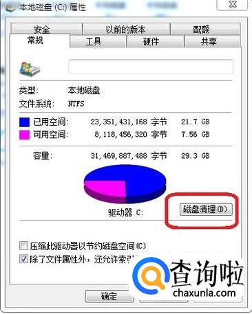 或者我们右键点击C盘,选择“属性”,弹出属性面板,我们点击“磁盘清理”。系统就会自动计算,可以释放出多少空间。