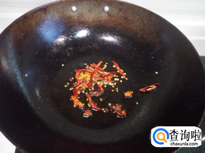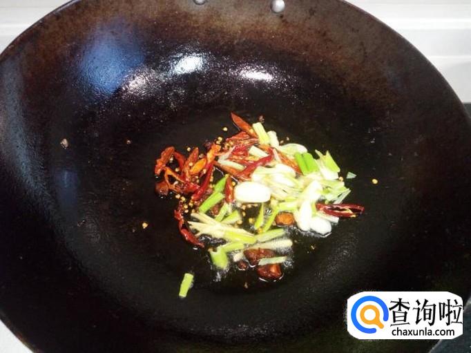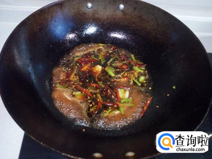 把煎塌鱼用的油,盛出多余的部分,留少许油在锅中,加热。油热后放入花椒,八角,红干椒爆锅,放入葱,姜,蒜,翻炒。