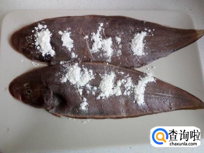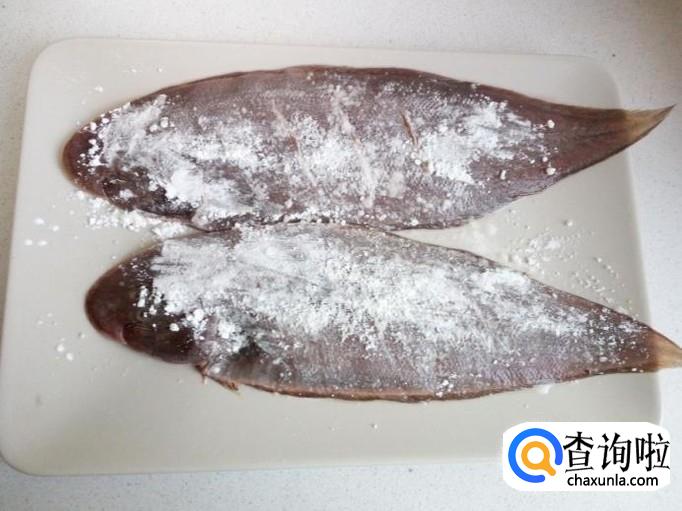 在鱼的两面撒些淀粉,涂抹均匀,避免煎塌鱼的时候破皮。