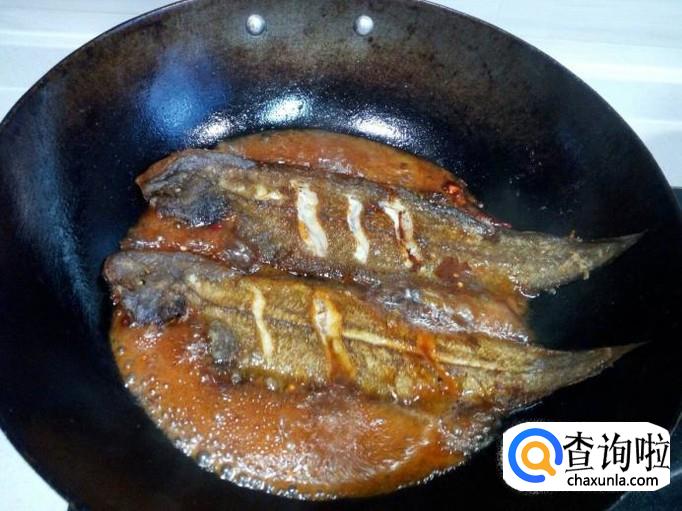 把调和好的料汁倒入锅中烧成汁,然后把煎好的踏板鱼放入锅中,略烧一下。
