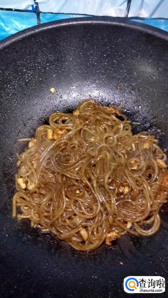 刚泡好的粉丝倒入锅中,和肉末一起翻炒,然后加入100克左右的清水。
