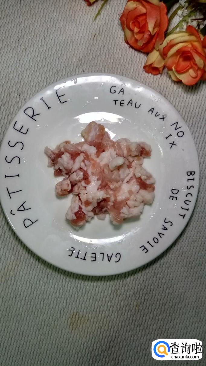 准备适量五花肉,洗净后切成碎末儿,尽量切得碎一些,这样可以更容易和粉丝粘连在一起。