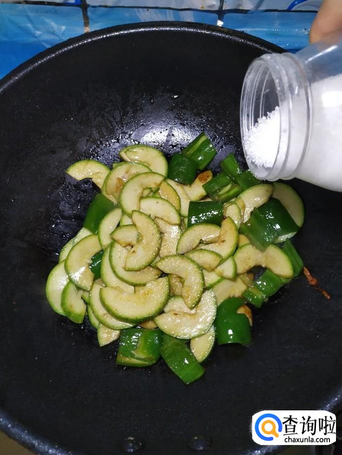 炒锅中再放入适量油,油热后,将青椒倒入锅中炒香,然后将处理好的西葫芦倒入锅中,翻炒均匀。