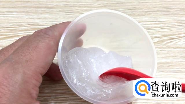 撒了盐之后,需要不停的搅拌直到成型。因为这是无硼砂无胶水的水晶泥,不像胶水和硼砂那样,放到一起马上就会成形。
