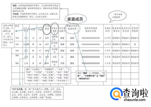 1.贫困户家庭基本情况。① 户主姓名、性别、家庭人口(与户口本信息不一致时,要注明原因)、民族、出生年月、联系电话等,填写方式与贫困户登记表或贫困户信息采集表、“一户一策”脱贫计划保持一致;②识别标准:“国家标准”;③家庭住址:县、乡、村、社;④贫困户属性:一般贫困户、低保贫困户、特困供养户;⑤主要致贫原因:按照家庭实际情况对应贫困户登记表、贫困户信息采集表、“一户一策”脱贫计划中致贫原因填写,最多不能超过两个;⑥耕地面积、林地面积、住房面积填写方式与国网保持一致;⑦劳动力:分普通劳动力、部分劳动力、丧失劳动力、无劳动力(16周岁以下,65周岁以上),子女上学的在劳动力一栏中据实填写上幼儿园、小学、初中、高中、高职大专、本科等。