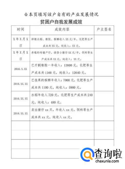 2.内容:对应相关帮扶措施记录帮扶后贫困户的生产、生活变化情况,特别是家庭增收与“两不愁、三保障”情况,以及转移性收入与财产性收入等情况。