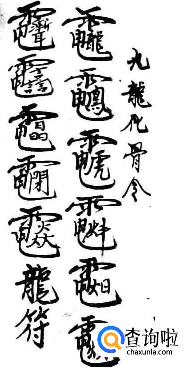第一种九龙化骨水。咒语:此碗化为东海大洋,咽喉化为万丈深渊,九龙归洞,诸肉诸骨万物化成水,金银铜铁锡万物化为水,吾奉太上老君急急如律令。符图见下图。此法主治一切硬物卡喉或服一切硬物。