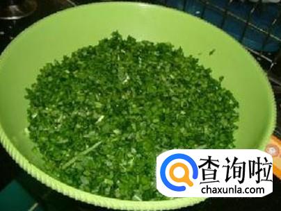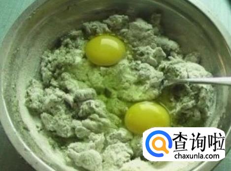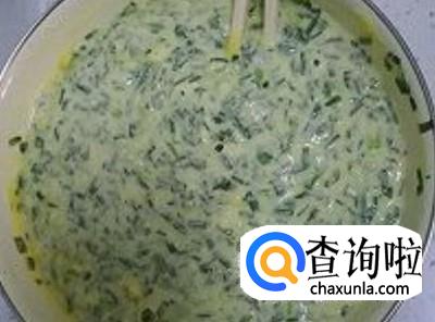把韭菜丁和面粉混合,加2个鸡蛋进去。