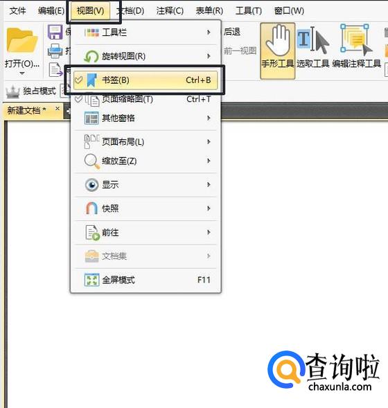 在文件中添加书签,点击菜单栏中选择视图选项,然后选择视图选项中的书签工具,点击书签工具。