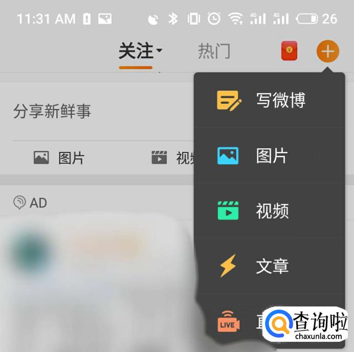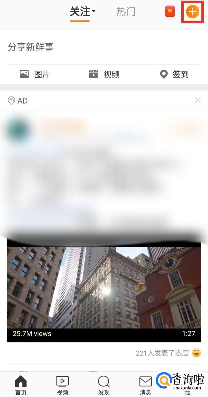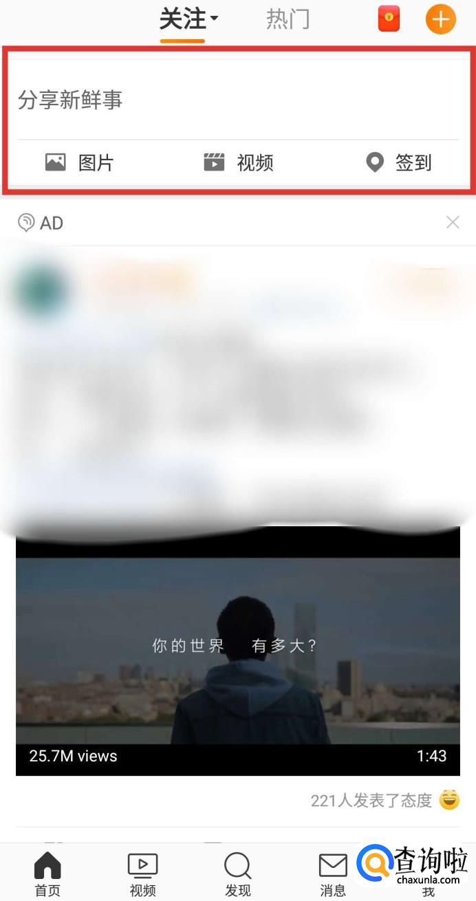 最新版本的修改是把按钮从底部挪到了右上角,我们先打开微博app,这里我们可以看到发微博一个快捷的窗口