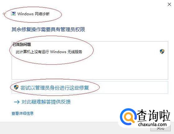 弹出"Windows 网络诊断"对话框,如图所示。显示"此计算机上没有运行Windows无线网络"故障信息,点击"尝试以管理员身份进行这些修复"按钮。