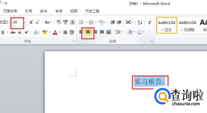 我们首先写上主题实习报告,然后将其设置为20的大小,之后点击居中按钮;