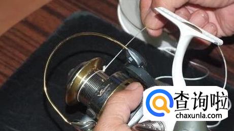将纺车轮的线杯架打开后,绑好的活套套在线杯上。抽紧钓线,使活套紧勒在纺车轮的线杯上。