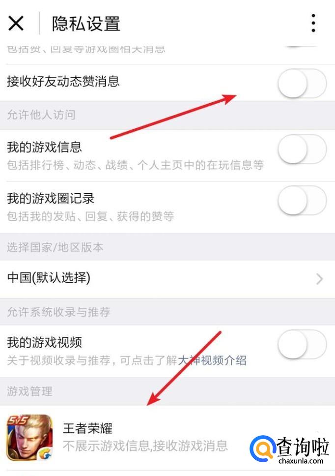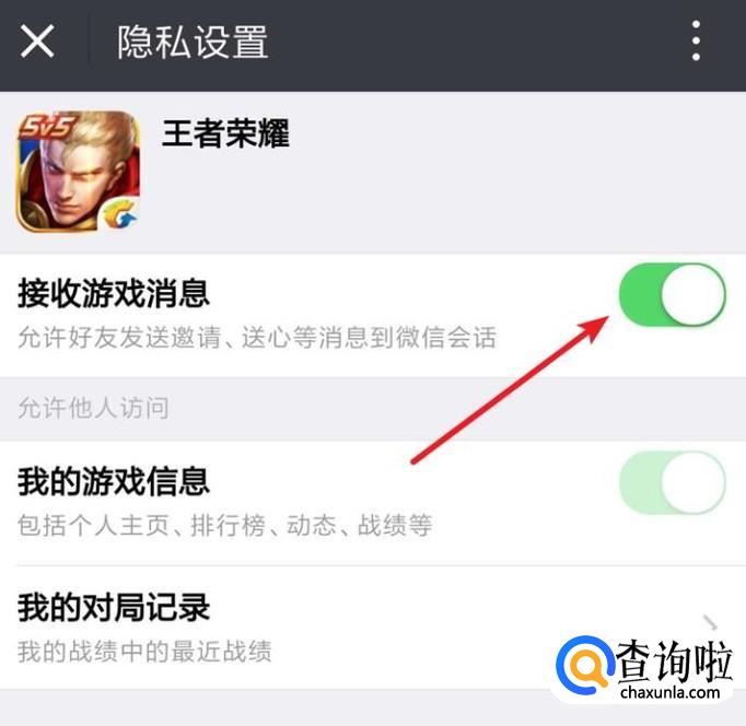 进去后,点击开关,把‘接收游戏消息’的开关关闭就行了。