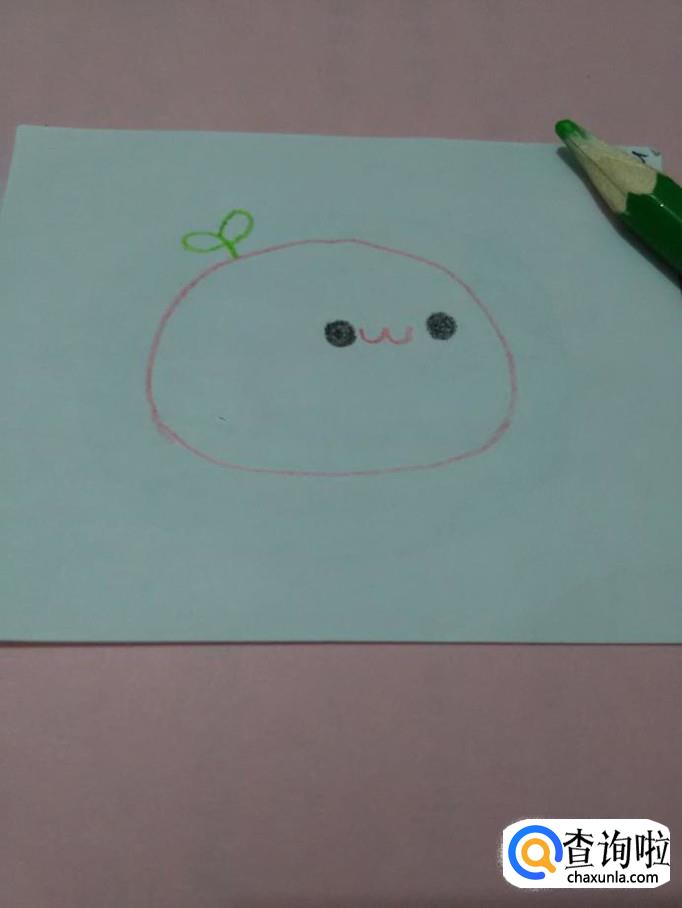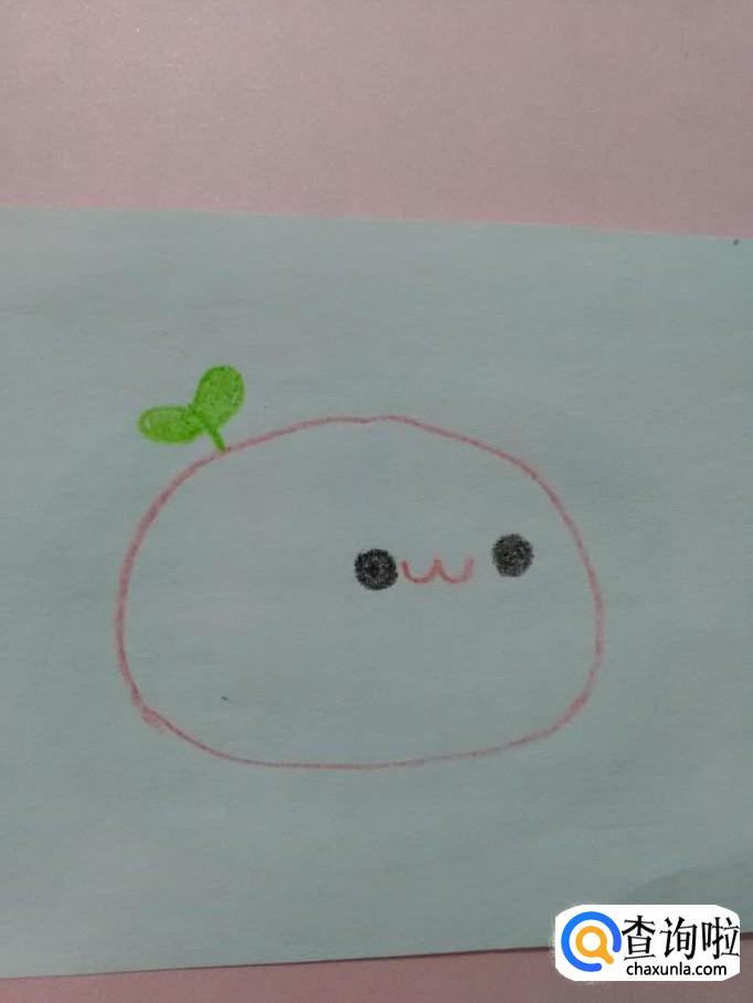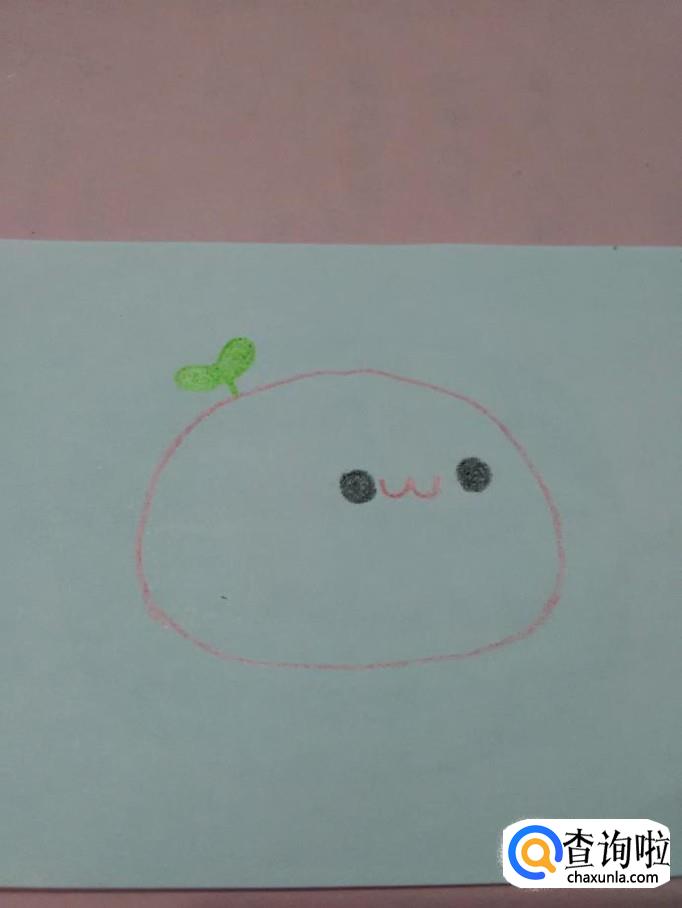 用绿色在它的头上画一条短线,在短线上面再画两个小的椭圆形,表示小草。