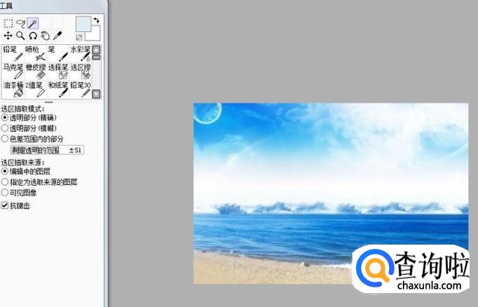 点击工具里的橡皮擦,在人物上面仔细地擦,就把人物上的大海擦掉了,人物就P到大海的照片上了。