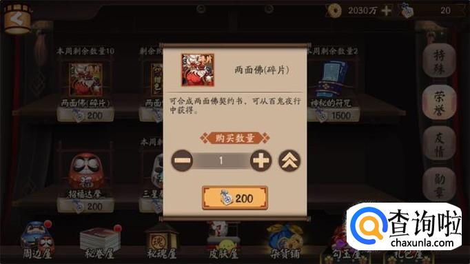最后再来说说如何获得两面佛,正常的召唤自然不用说,两面佛的碎片可以在杂货铺中,用斗技荣誉点兑换,而且还能兑换两面佛的新皮肤,这个人人可得的SSR式神还是非常给力的。