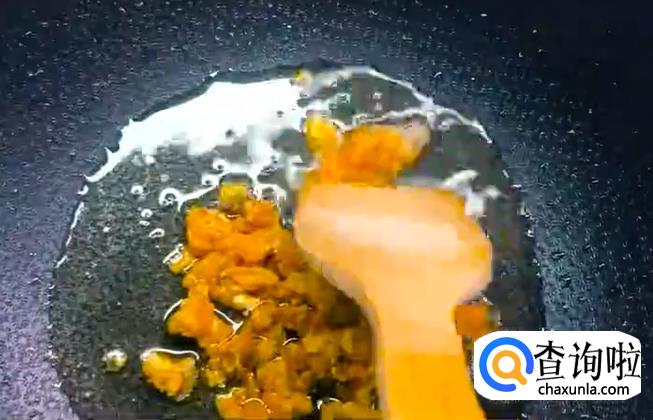 之后留少量底油,加入蛋黄炒碎。