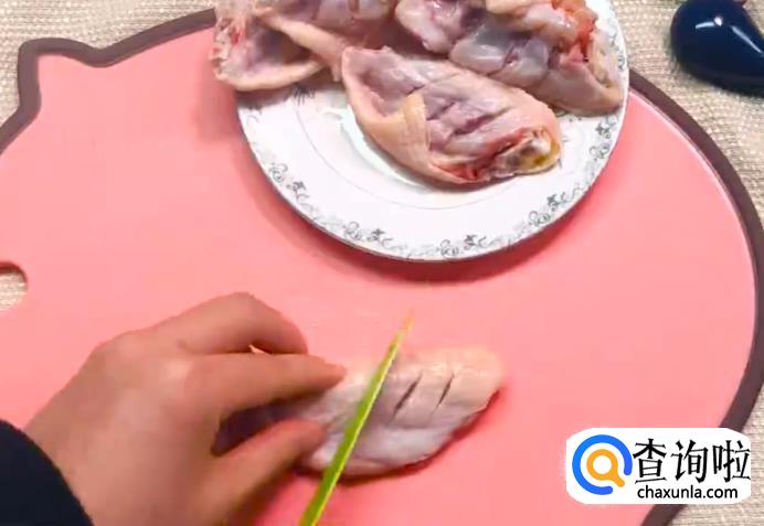 首先把鸡翅洗净,切三字花刀。