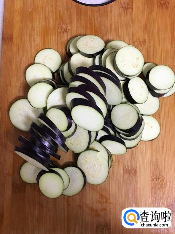准备两个新鲜茄子,清洗干净后,切成5mm左右的厚片。