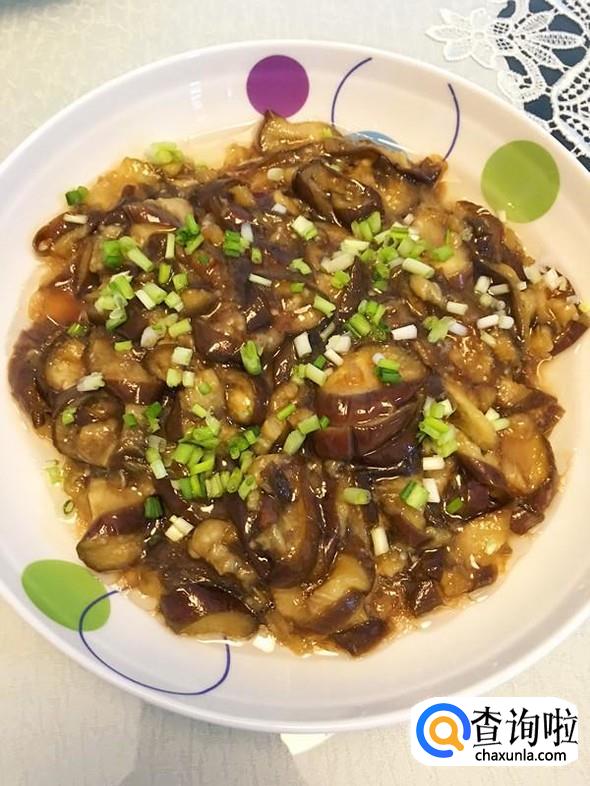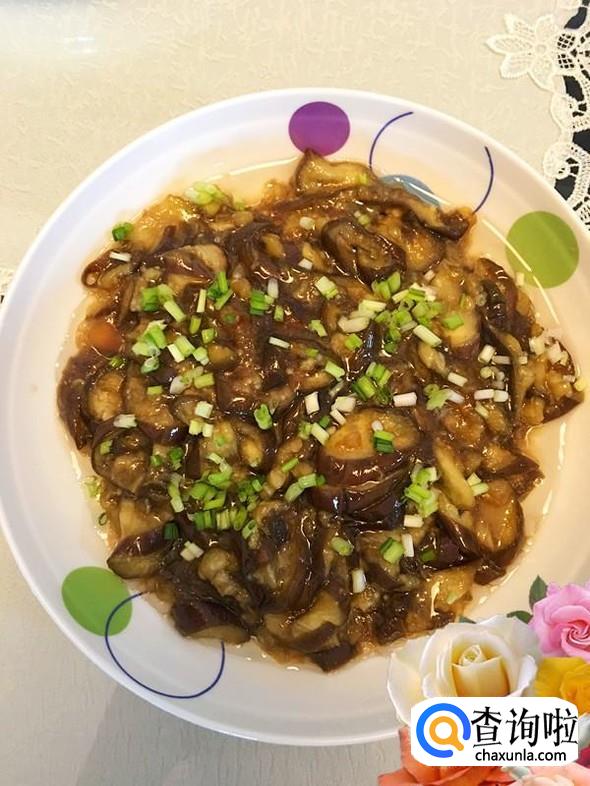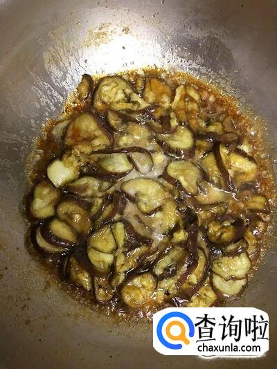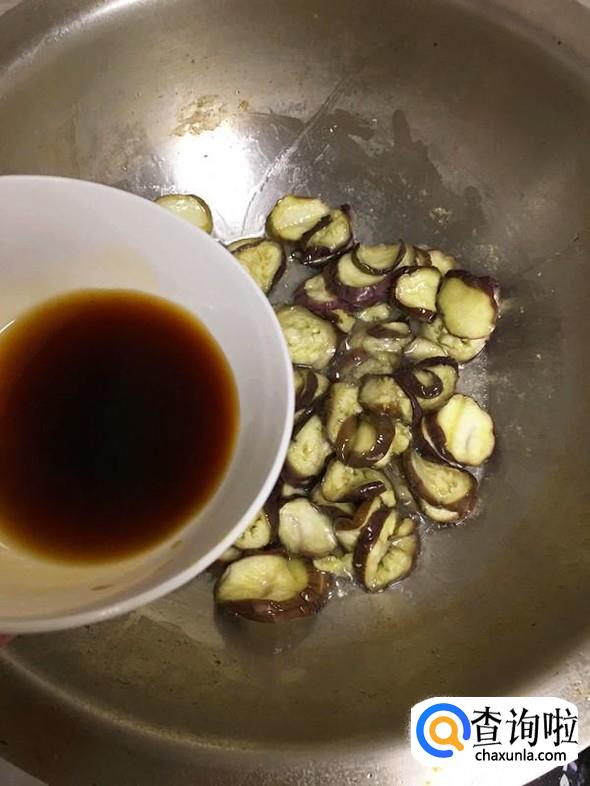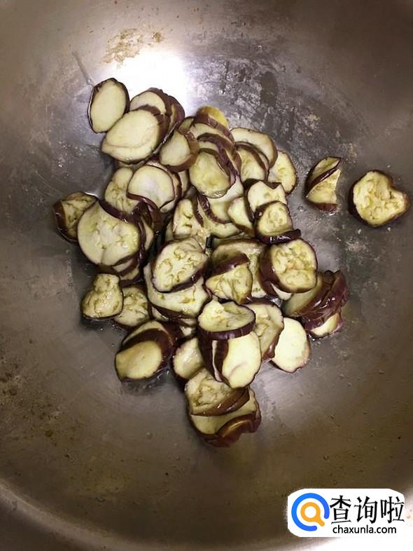 蒸好的茄片取出,滤出其中的汁水。然后,炒锅中放入少许食用油,油温热时,把茄片倒入锅中。
