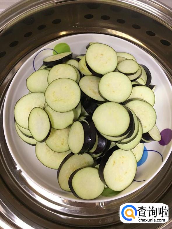 把茄片均匀地摆放在盘中,放入蒸锅,水开后转中火2分钟左右。