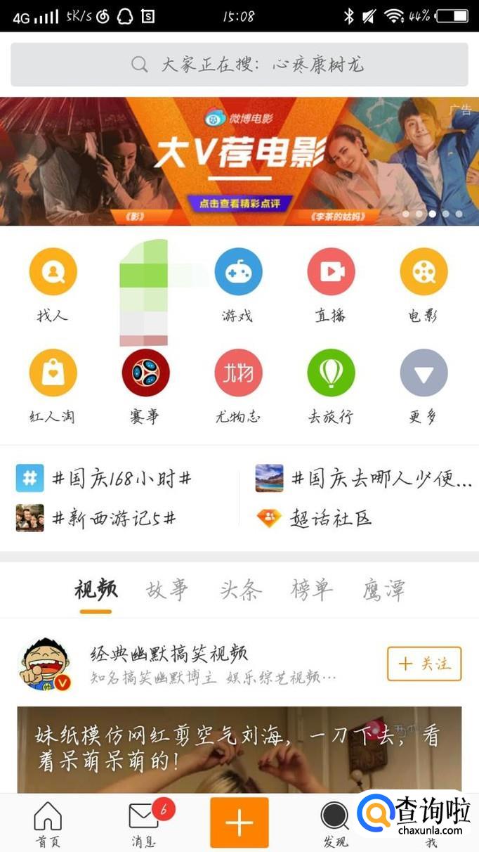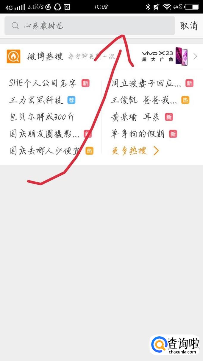 点击最上方的搜索框,如图1箭头所示。在搜索框中输入自己好朋友的微博名字。