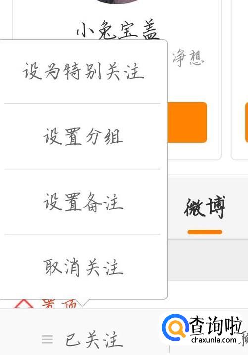 这样你就关注了你的好友了,再点击“已关注”选项,如图1箭头所示。你可以给好友备注以及移动分组。