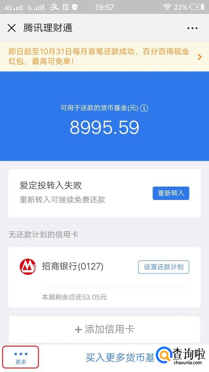 还款秘笈就在理财通里面,我们继续点击左下角的“更多”按钮,如图所示。
