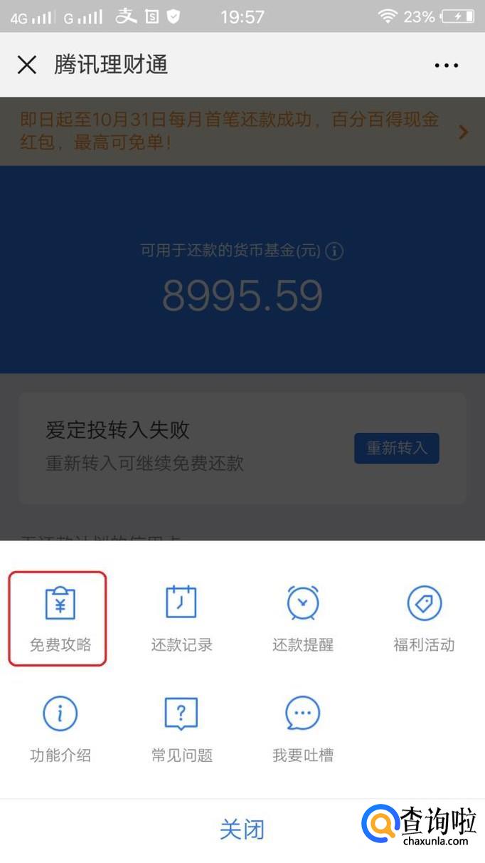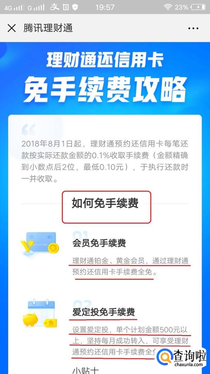可以看到,有两种方式可以免费还信用卡,比较简单的就是设置“爱定投”,每月投500以上就可以了;比较难的一种方法就是成为理财通的黄金会员或更高级别会员(理财值10万以上),以上两种方法都可以享受免费还信用卡。