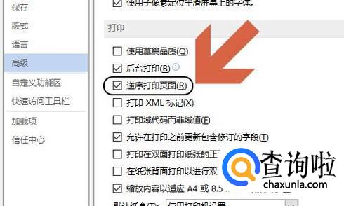 点击对话框左侧的“高级”,然后在右侧对应的打印选项中,我们勾选“逆序打印页面”,这样打印完成以后最上面的就是第一页,省去了整理的时间;